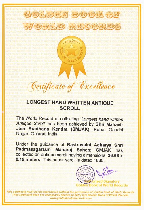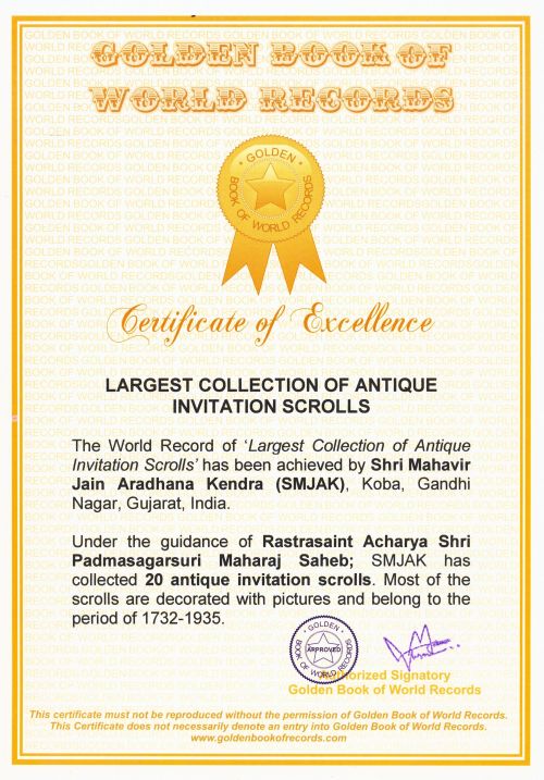 Shree Mahavir Jain Aradhana Kendra, Koba, has been honored with recognition in the Golden Book of World Records, a testament to its remarkable contributions to Jain spiritual heritage and community service. This award highlights the Kendra’s dedication to preserving and promoting the teachings of Jainism and creating a sanctuary for spiritual growth and enlightenment.